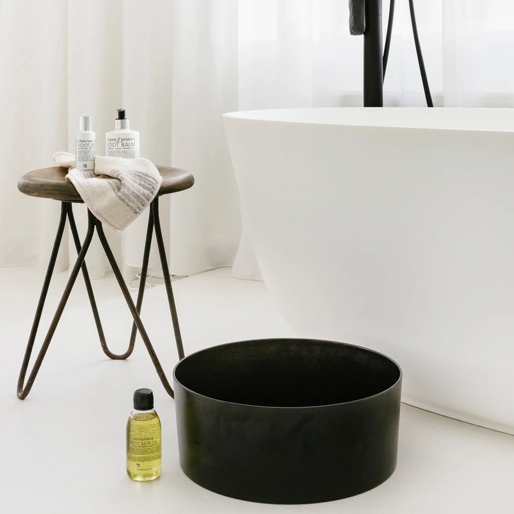 Omdat hij zo groot is, kunnen zelfs de grootste voeten genieten van een voetbad in de never ending circle. Vul het voetbad met warm water en een geutje Revitalising Foot Bath Oil. Laat je voeten 20 minuutjes weken. Haal je voeten uit het voetbad, scrub met Charcoal Detox Foot Scrub en was ze met Skin Wash Peppermint of Skin Wash Sage. Droog af en smeer in met Repair & Protect Foot Balm, Intensive Recovery Wax of Freshen Down.